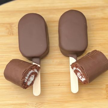 chocolate cake mixed with swiss rolls and covered in milk chocolate